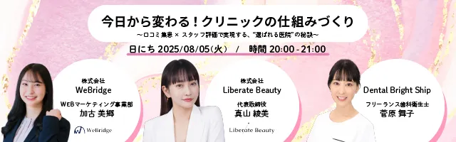 クリニック経営には多くの課題がありますが、その中でも新規患者の獲得とスタッフの評価は特に重要です。8月5日に開催される無料ウェビナーでは、これらの問題に対する包括的な解決策を提案します。このセミナーは、株式会社Liberate Beautyと株式会社WeBridgeが協力して実施します。