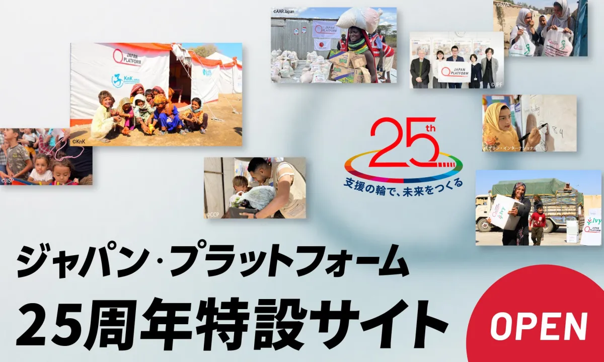 緊急人道支援を行う国際NGO「ジャパン・プラットフォーム」(JPF)が、2025年8月10日に設立25周年を迎えるにあたり、特設サイトを本日公開しました。この特設サイトは、これまでの25年間の活動を振り返り、関わってくださった方々への感謝を伝えるとともに、これからの支援の形について皆さんと一緒に考える場として設けられました。