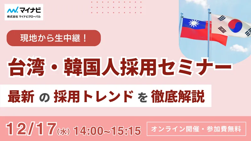 2025年12月17日(水)、株式会社マイナビグローバルが主催する外国人採用セミナーがオンラインで開催されます。このセミナーは「台湾・韓国から生中継!最新の採用トレンドを徹底解説」というテーマのもと、インバウンド需要の増加に伴う台湾・韓国人材の採用ニーズの高まりを踏まえた内容になっています。