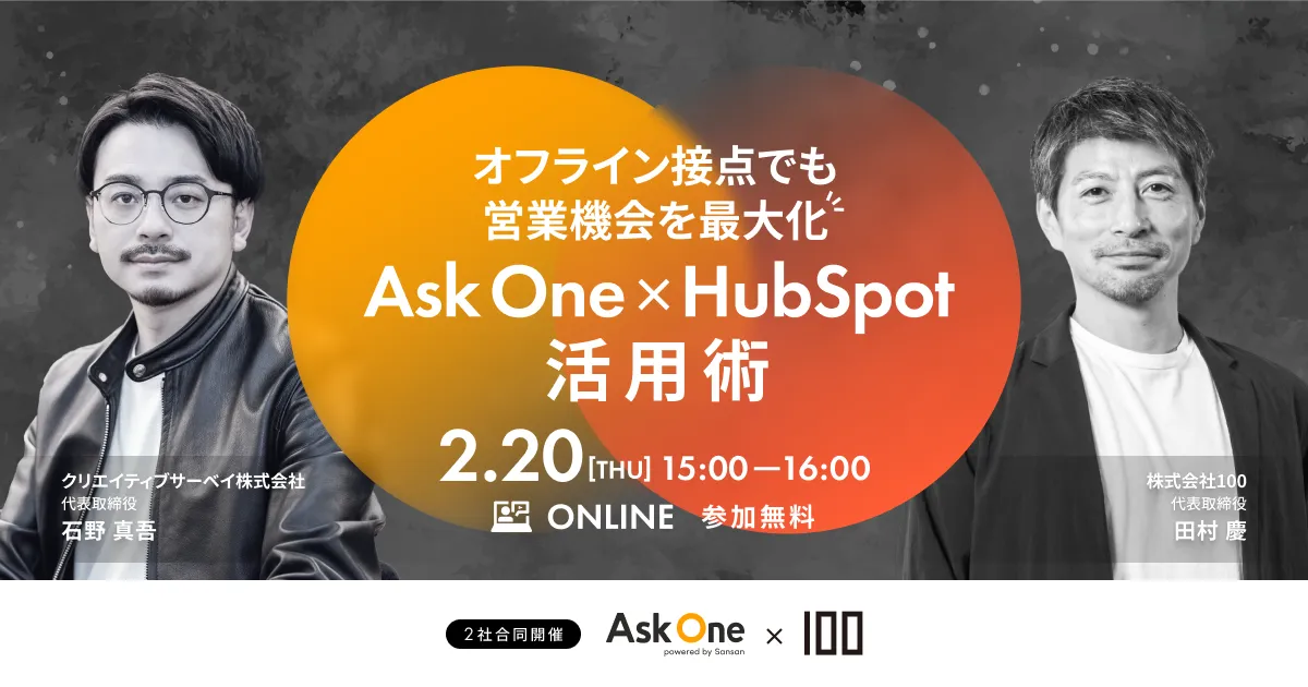 2025年2月20日、株式会社100(ハンドレッド)とクリエイティブサーベイ株式会社の共催で、オンラインウェビナー「オフライン接点でも営業機会を最大化!Ask One × HubSpot活用術」が開催されます。デジタルマーケティングが進化し続ける中、このウェビナーではオフラインでの活動が持つ価値を再確認し、実際に営業にどう活かすかに焦点を当てます。
