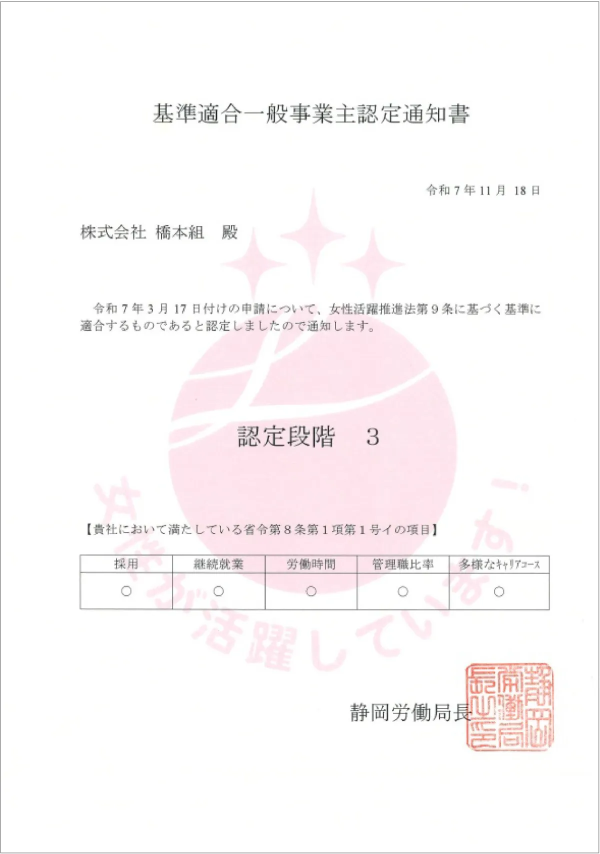 株式会社橋本組(静岡県焼津市)は、自社の女性活躍推進の取り組みとして、国が定めた「えるぼし認定」の最上位ステータスである認定段階3を取得しました。この成果は、建設業界において特に難易度が高い評価項目についてすべての基準を満たした企業のみが得られる栄誉です。