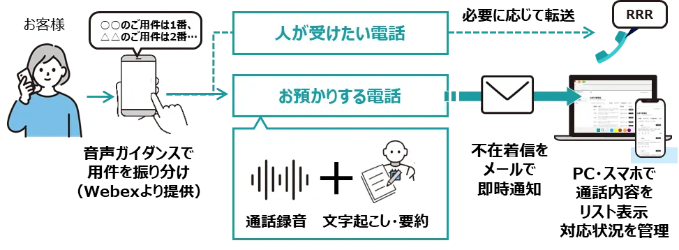 「おまかせAIでんわ」は、こうした問題を解決するため、AI技術を活用しています。具体的には、留守番電話に残されたメッセージを自動で文字起こしし、要約を行うことで、要件を迅速に把握することが可能となります。また、通話履歴の管理や対応メモの記録により、折り返し漏れや対応忘れを防止します。これにより、企業は電話応対業務の負荷を軽減し、ビジネスの生産性を向上させることが期待されます。