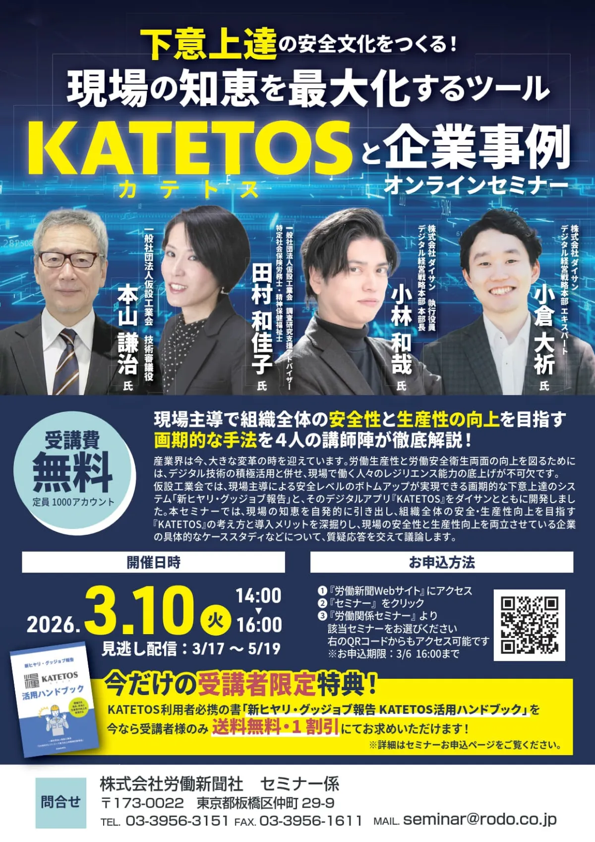 本セミナーはオンラインで行われ、参加費は無料です。定員は1000アカウントまでとなっており、定員に達し次第受付は終了しますので、参加希望の方はお早めに申し込みをおすすめします。申し込みは、労働新聞社の公式サイトから行えます。