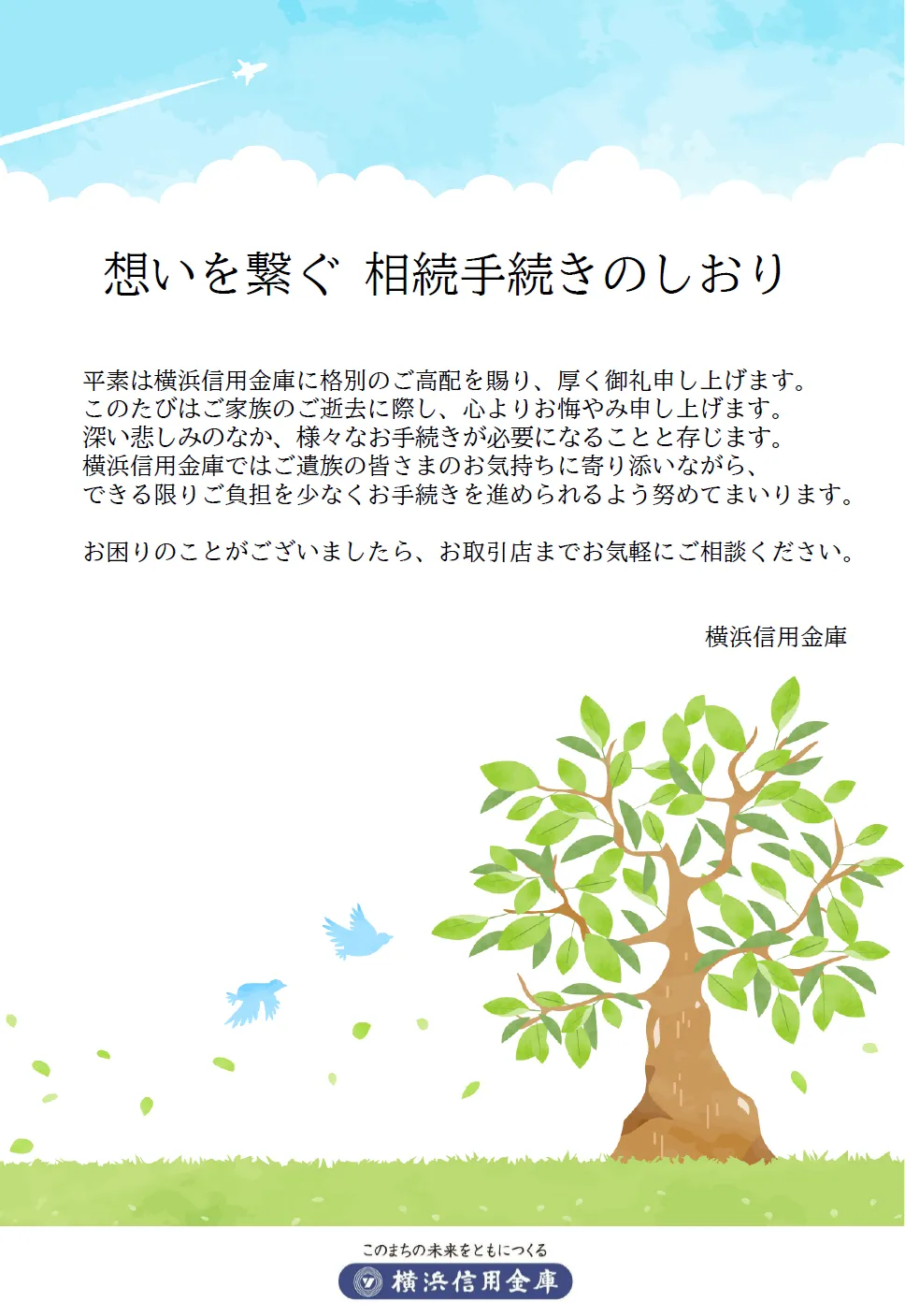 グリーフケアの一環として、お客様の思いに寄り添い、スムーズに手続きが進むよう「想いを繋ぐ相続手続きのしおり」というリーフレットを作成しました。これにより、ご遺族が抱える負担を軽減し、重い心情に少しでも寄り添うことができるよう努めています。