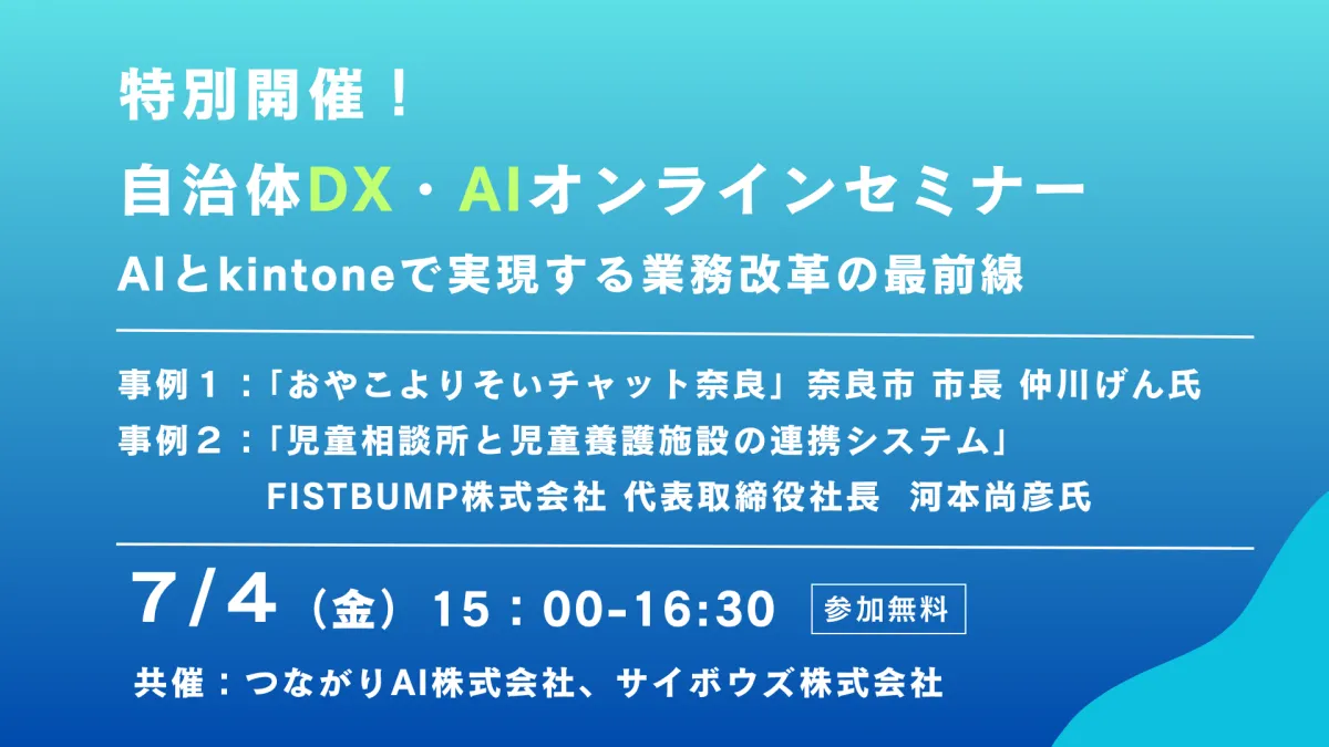 つながりAI株式会社が主催する「特別開催!自治体AI・DXオンラインセミナー ~AIとkintoneで実現する業務改革の最前線~」が2025年7月4日(金)に行われます。このセミナーは、全国の自治体職員を対象に、最新のAI技術と業務改革の事例を学ぶ良い機会となっています。