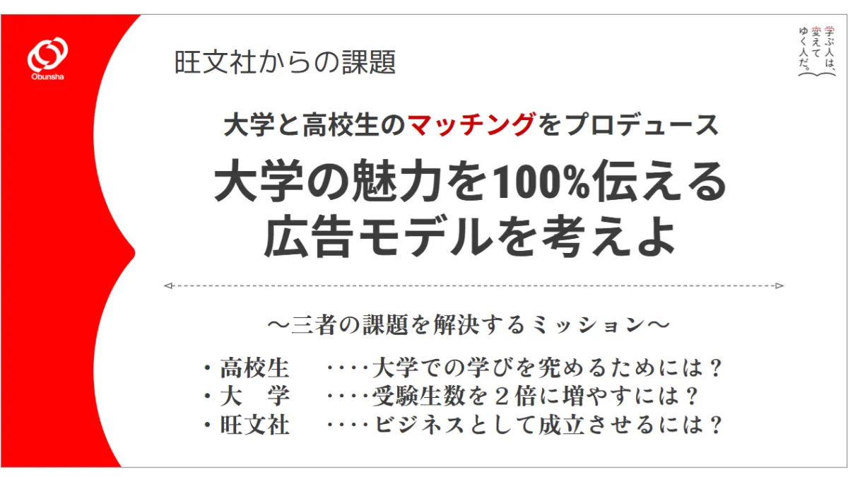この「探究Ⅱ」という授業を通じて、高校生たちは非常に多くのことを学びました。「大学での学びについて考えるきっかけになった」との意見や、「進路が明確になった」といった声も上がり、高校生たちにとって自身の将来を見つめ直す貴重な機会になったことは間違いありません。彼らの提案からは、未来の広告モデルについての見識が窺え、旺文社との協力を通じて新たなかたちの広告が如何に形成されるかの一端が見える内容となりました。