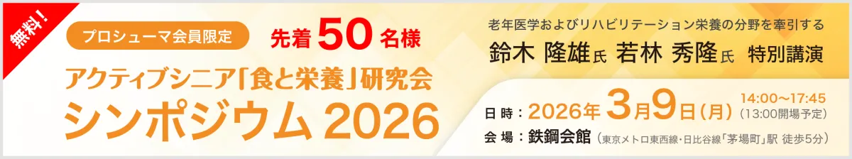 2026年3月9日(月)、東京の鉄鋼会館にて「アクティブシニア『食と栄養』研究会 シンポジウム2026」が開催されます。このシンポジウムは、プロシューマ会員を対象とした無料のイベントで、参加者には最新の老年医学やリハビリテーション栄養に関する情報が提供される貴重な機会です。