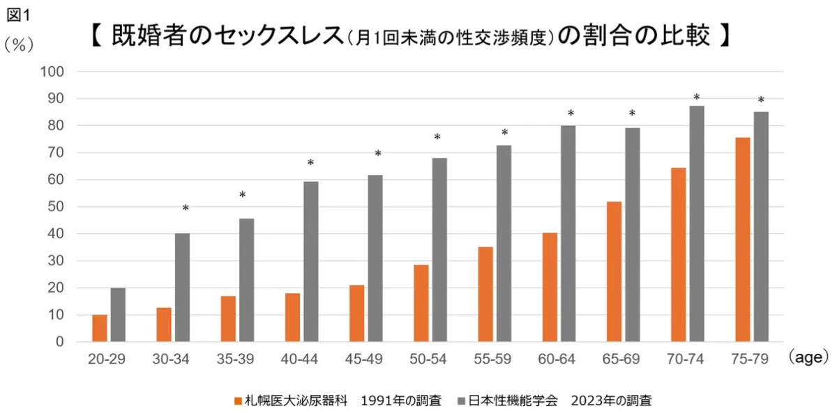 最近発表された調査によると、日本人男性の性機能が過去30年間で著しく低下していることが明らかになりました。この調査は一般社団法人日本性機能学会の臨床研究促進委員会が行い、1991年と2023年のデータを比較したものです。調査によれば、特に30代後半から50代の男性において、性交渉の頻度や勃起機能に大きな変化が見られました。