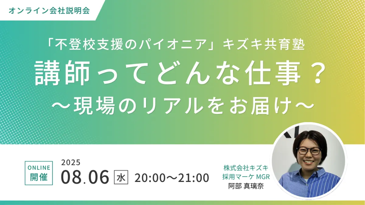 キズキ共育塾では、ただ今、講師を募集中です。コミュニティの一員として生徒たちに寄り添い、リアルな支援を行う講師たちは過去に、様々な事情を抱えた方々です。元不登校の生徒であった講師や、就活に悩んでいた経験を通じて生徒の心情を理解できる講師が揃い、彼らは同じような課題を抱える生徒への支援を心から行っています。キズキ共育塾の理念には、「何度でもやり直せる社会をつくる」という願いが込められています。