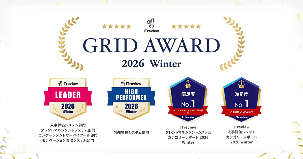 受賞カテゴリには「人事評価システム部門」、「タレントマネジメントシステム部門」、「エンゲージメントサーベイツール部門」、そして「モチベーション管理システム部門」が含まれ、また「労務管理システム部門」では「High Performer」も受賞しています。特に「人事評価システム部門」と「タレントマネジメントシステム部門」では顧客満足度No.1を見事に獲得しました。