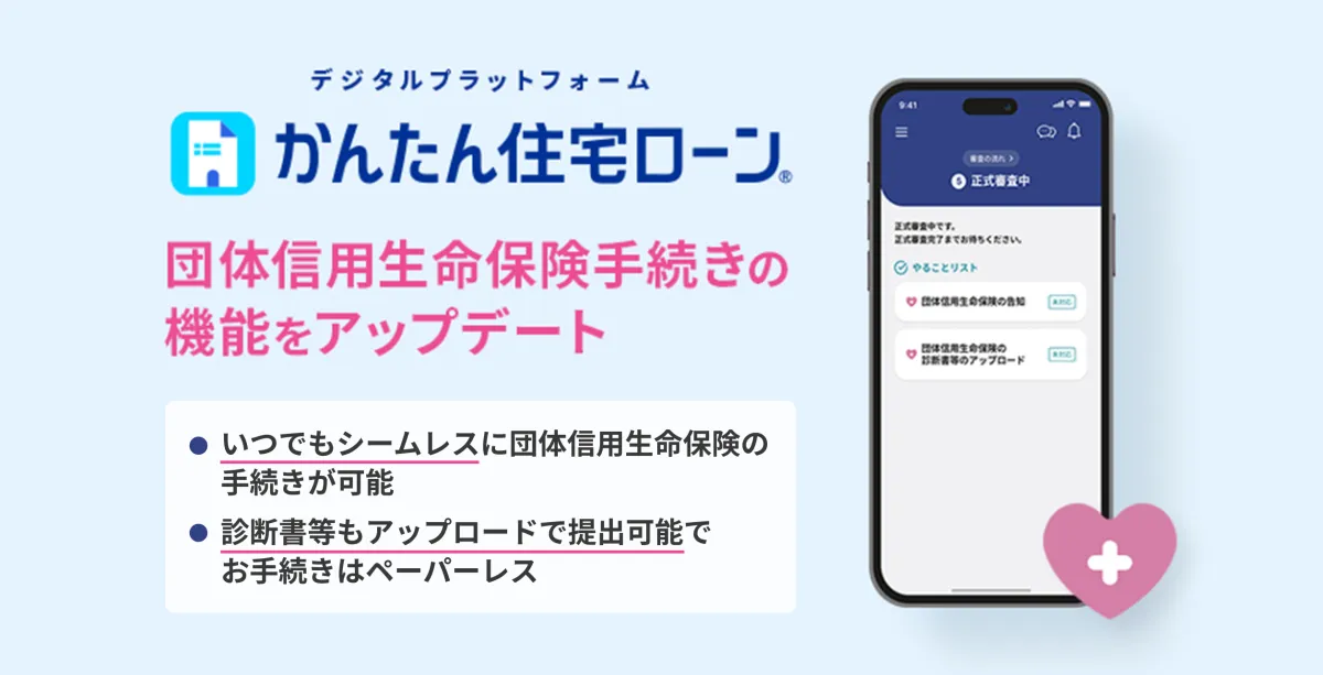 「かんたん住宅ローン」は、住宅ローンの申込から実行までをオンラインで行えるプラットフォームです。これまでも住宅ローンの申し込みは手軽にできましたが、新たに団体信用生命保険の手続きも同プラットフォーム内で完結できるようになりました。この仕組みにより、従来は別途保険会社への手続きが必要だった団体信用生命保険も「かんたん住宅ローン」から一貫して行うことが可能となりました。