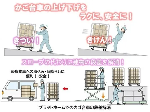 「段差らく~だ」は、プラットフォームとトラックの荷台との高低差を調整することで、かご台車や平台車などがスムーズに移動できるように設計されています。これにより、荷役作業の効率化が図られ、安全な作業環境が整います。特に、油圧システムを活用することで、車輪の出し入れを簡単に行い、安定した昇降が実現されています。また、手押しで本体を移動できる設計は、エレベーターとしての規制からも免れており、導入のハードルを下げる要因となっています。