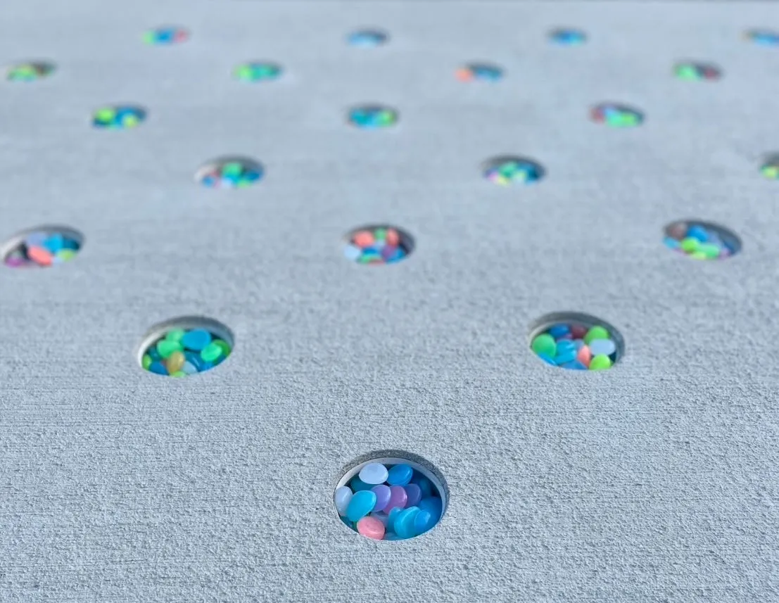 Dotconの丸穴にカラフルなアクリルチップやビー玉を埋め込むと、光の反射により鮮やかに輝き、魅力的な舗装面を作り出します。また、小さなキャラクターやミニチュアを配置すれば、通行人は思わず笑顔になるような、遊び心あふれる空間が生まれます。このような演出は、季節やイベントごとに入れ替えられるため、常に新たな楽しみが感じられるのが特徴です。