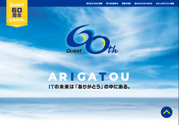 記念サイトでは、「∞ (無限大)の未来に向かった航海」をテーマに、波のイメージを用いています。また、全体はインフィニティマークの形にデザインされ、IT分野での無限の可能性を象徴するロゴが印象的です。この斬新なデザインは、クエストが追求する冒険心を感じさせます。
