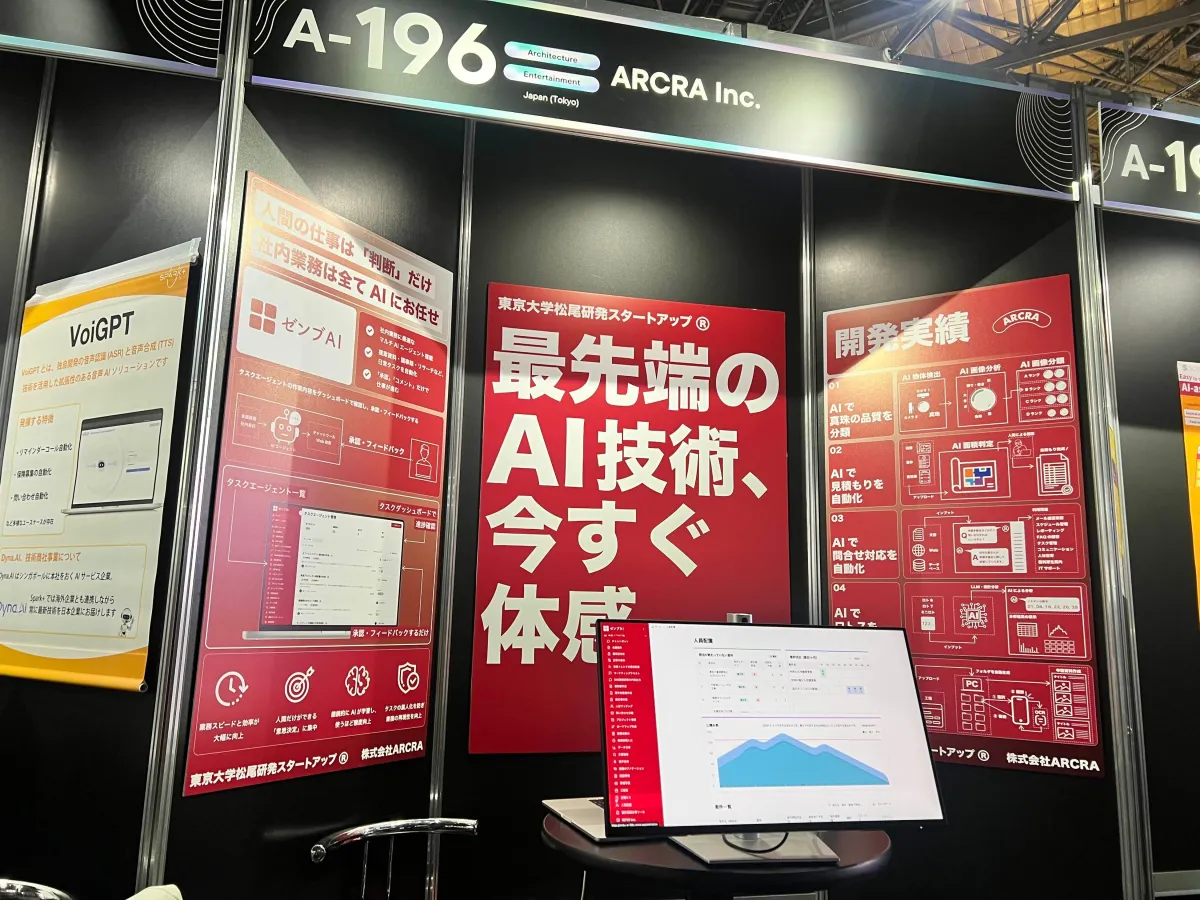 ブースでは実際に新サービスを体験できるモニタも用意され、開発実績の展示も行われました。東京大学 松尾研のアカデミックな視点と、受託開発から得られた課題意識を基に開発されたこの新サービスは、各現場のニーズに応じた具体的な提案が可能とされています。問い合わせを通じて、より多くの企業に提案したい考えです。
