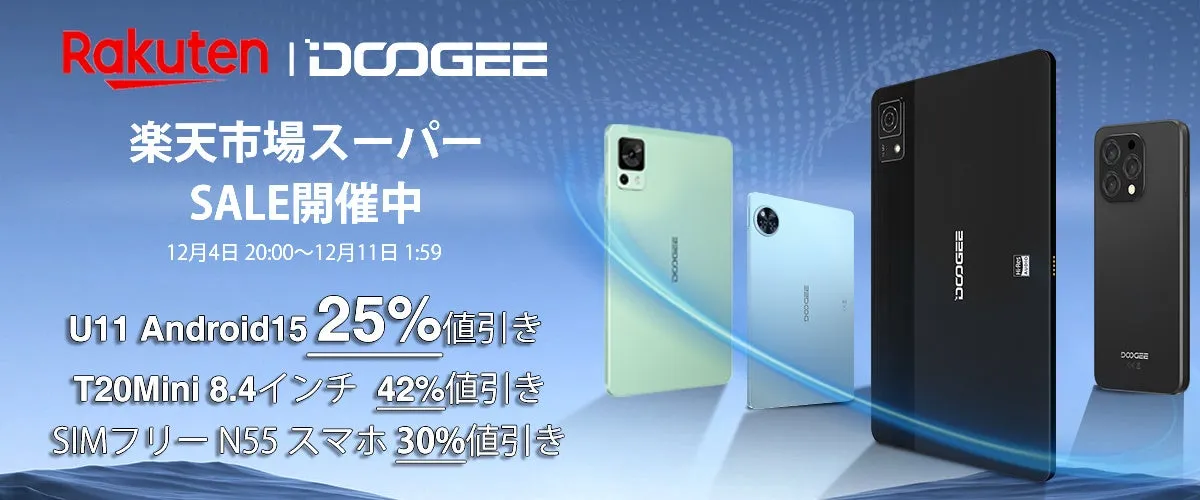 今夜8時から始まる「楽天市場 スーパーSALE」、DOOGEEストアがその主役として再び登場です。このセールは、幅広い商品ラインナップを誇り、タブレットやスマートフォン、頑丈なスマホなど、ユーザーのニーズに応じたアイテムが揃っています。