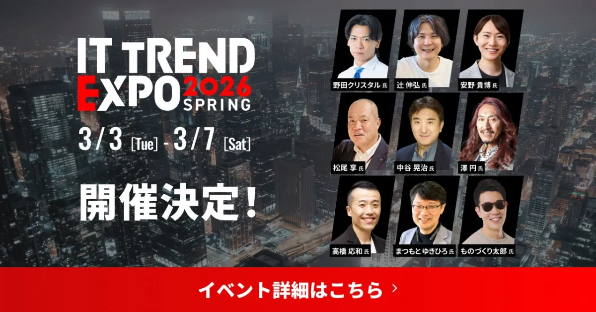 2026年3月3日(火)から7日(土)までの5日間、株式会社Innovation & Co.が主催する「ITトレンドEXPO2026 Spring」が開催されます。これは、全国からオンラインで参加できるITに特化した展示会で、特にAI、DX(デジタルトランスフォーメーション)、サイバーセキュリティ、バックオフィスの効率化など、ビジネスの現場で実際に成果を上げた事例をご紹介します。