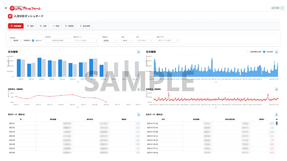 このソリューションを利用することで、観光庁の「観光入込客統計」に準拠した信頼性の高いデータを取得し、施策の立案や効果検証に役立てることができます。さらに、さまざまな外部要因を考慮し、地域特有の観光動向をより詳しく分析できます。
