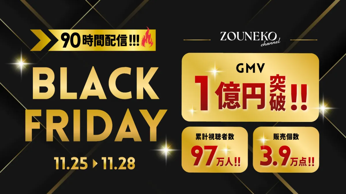 国内最大規模を誇るライブコマースチャンネル「ぞうねこちゃんねる」は、この度のブラックフライデー期間中に驚異の記録を達成した。運営企業の株式会社Cellest(本社:大阪府大阪市)が発表したところによると、特別企画『ブラックフライデー 90時間連続配信チャレンジ』において、期間内の流通取引総額(GMV)が1億733万6,153円に達したのだ。特に注目すべきは、配信が行われたのは連続して90時間という長時間であったことだ。
