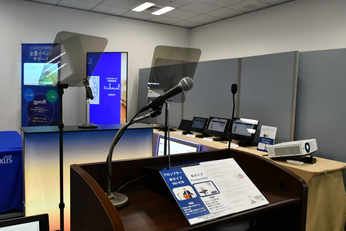- - プロンプター: スピーカーの目の前にスピーチ原稿を表示することができ、自然な目線で議事を進めることが可能です。特にオンライン配信では、その効果が際立ちます。