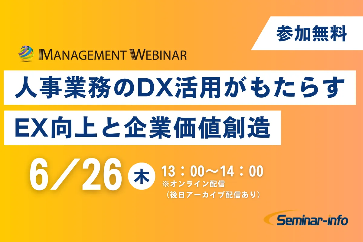 2025年6月26日(木)、株式会社セミナーインフォは「人事業務のDX活用がもたらすEX向上と企業価値創造」と題したオンラインセミナーを開催します。このセミナーは参加費が無料であり、企業における人事業務のデジタルトランスフォーメーション(DX)の活用法を学ぶ絶好の機会です。