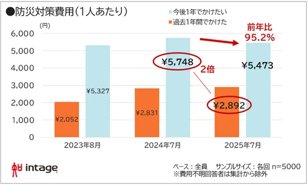 調査によると、過去1年間にかけた防災対策費用は平均2,892円と微増したものの、今後かけたいと考える費用は前年比で95.2%の5,473円と、減少に転じました。この現象は、物価高や防災意識の減少が要因と考えられます。一方で、「理想と現実」の間には大きなギャップが存在し、実際の支出の約2倍の差があることが指摘されました。