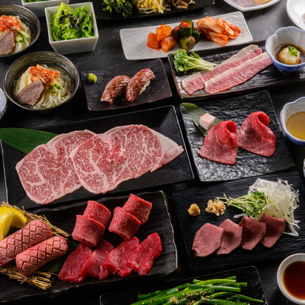- 日替わり希少部位、上赤身、炙りロース、特選カルビ、和牛サーロイン焼きすき(卵黄付き)