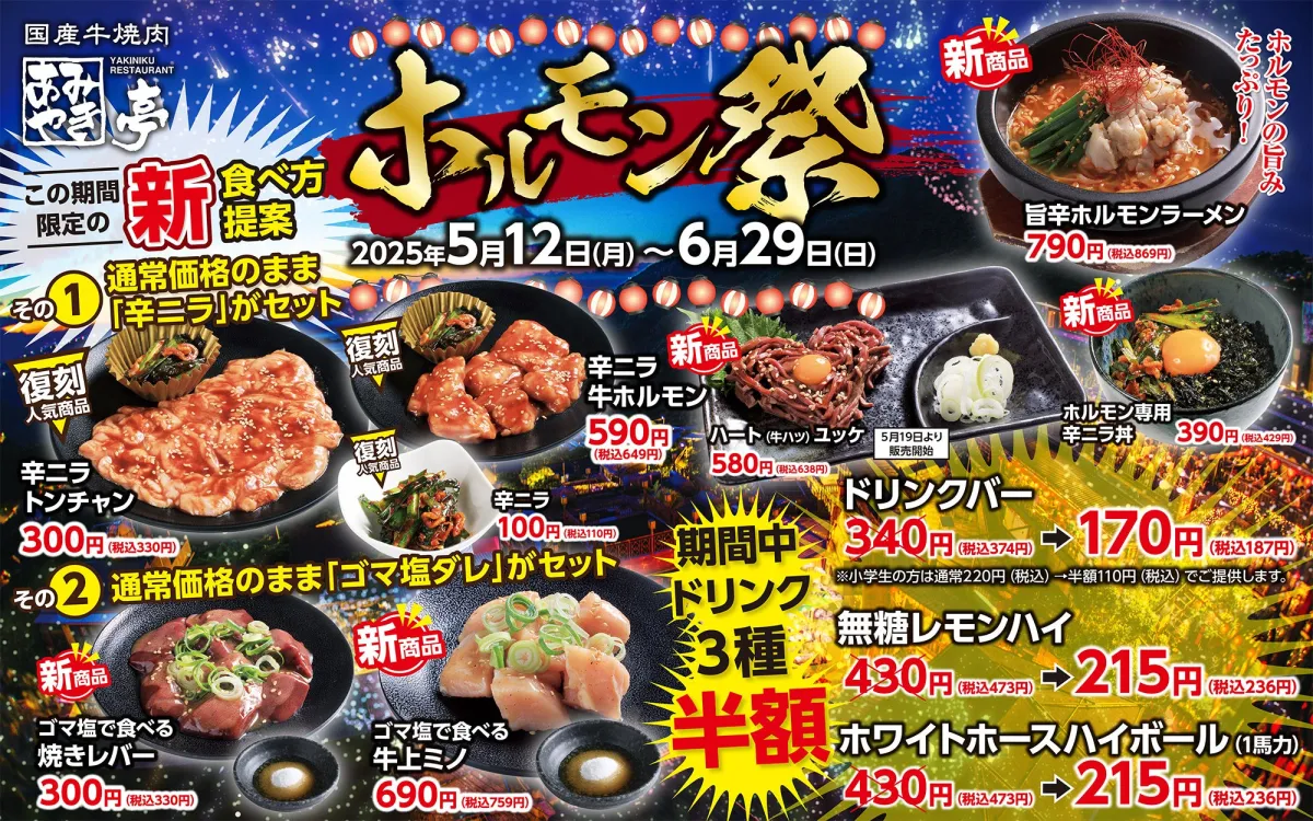 愛知県春日井市のあみやき亭中部では、ただいま注目の『ホルモン祭り』が開催されています。この祭りでは、ホルモンを新たな楽しみ方で味わえる特別メニューや、特別なドリンクが揃っています。