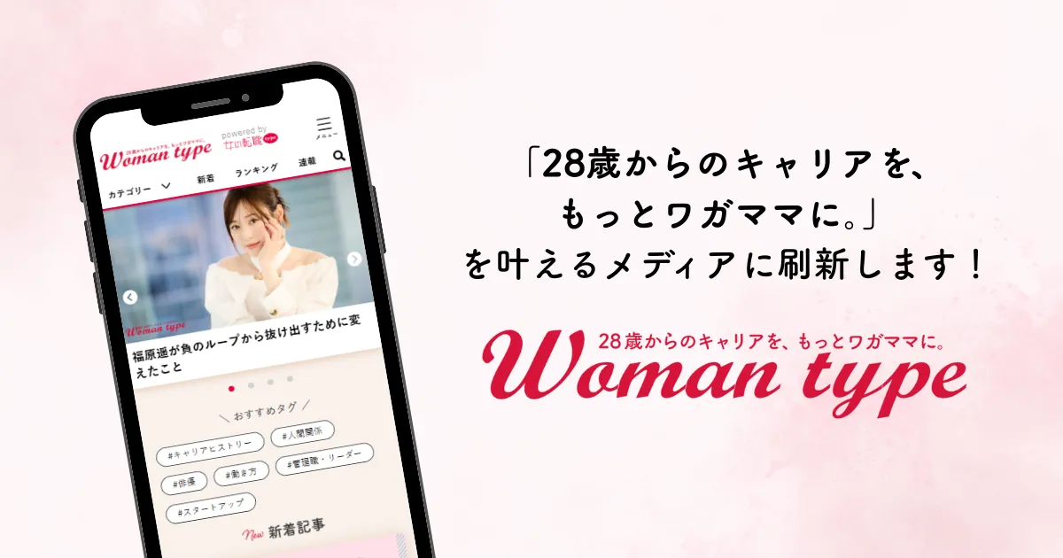 Webメディア『Woman type(ウーマンタイプ)』が、サイトリニューアル10周年を迎え、リブランディングを行いました。その新コンセプトは、「28歳からのキャリアを、もっとワガママに。」です。働く女性が、自分らしいライフスタイルを追求できるような情報を発信していくことを目指しています。