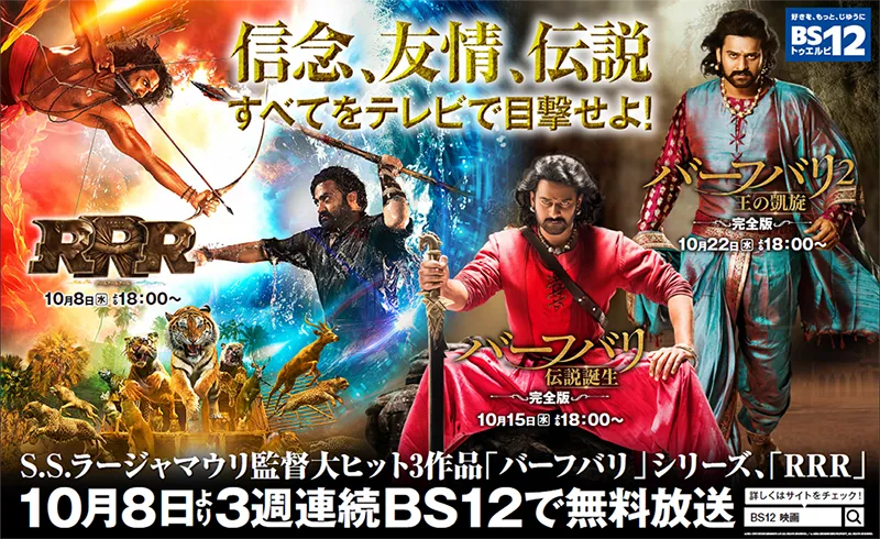 BS12 トゥエルビでは、特別に選ばれたインド映画の特集をお届けします。これまでの人気作『RRR』と『バーフバリ』二部作が、無料放送初登場として3週連続で放送されることが決まりました。新たな映像体験をお楽しみください。