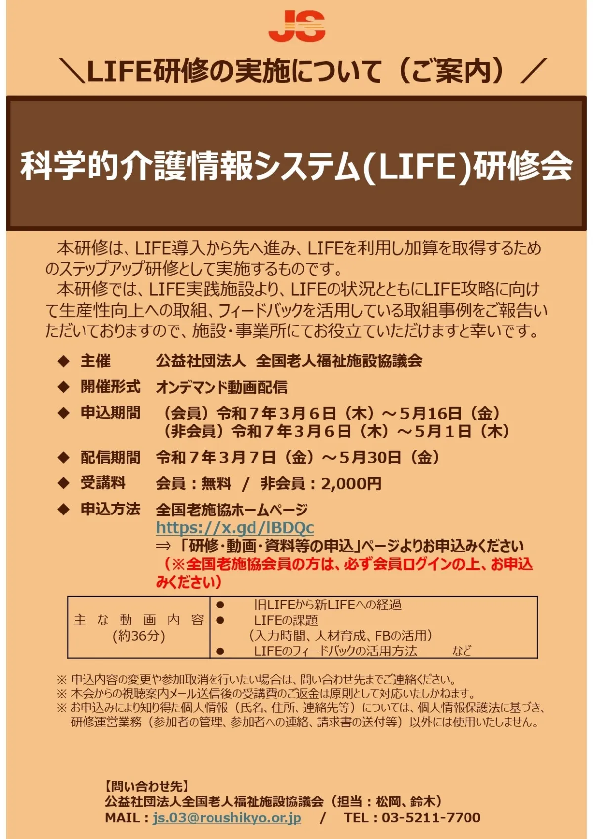 【全国老施協ホームページ】科学的介護情報システム(LIFE)研修会に関する詳細は