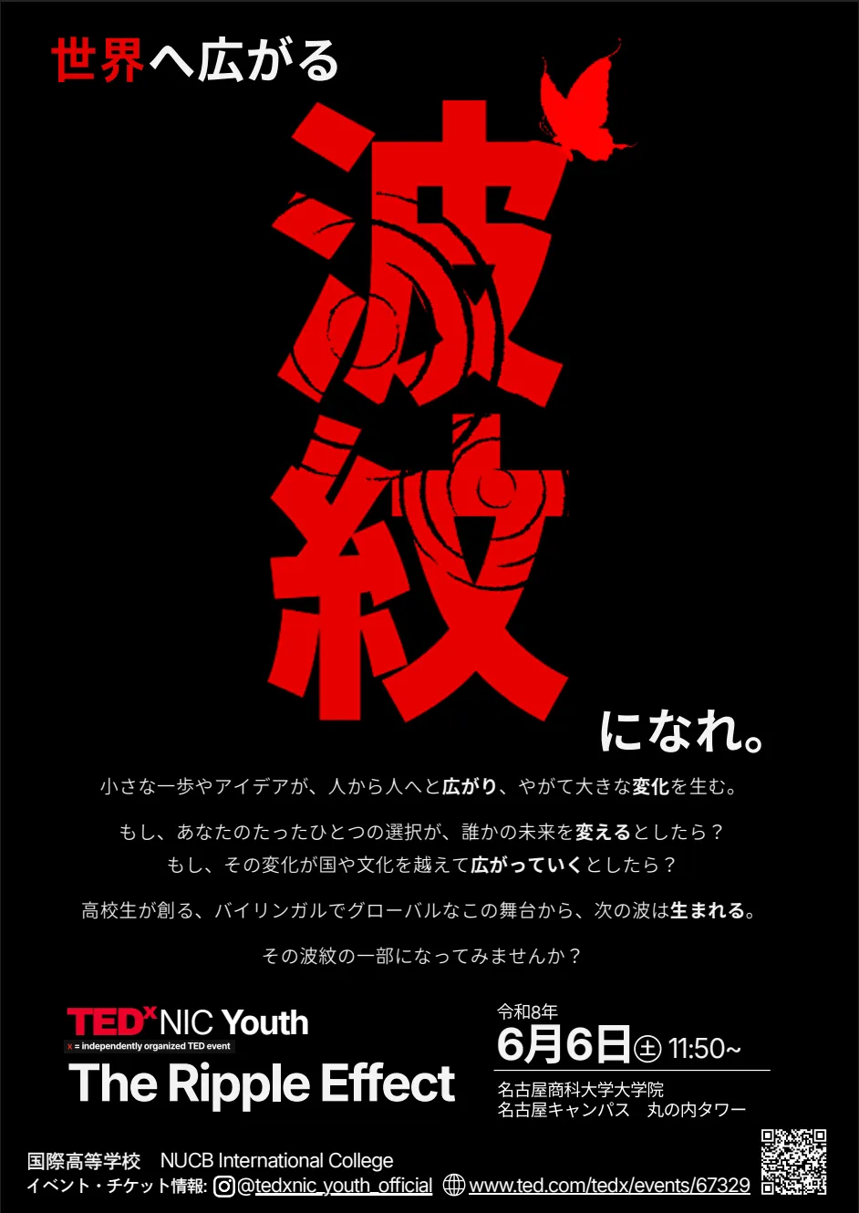 「TEDx NIC Youth」は、大小さまざまな波の一部になる機会を提供します。ここから生まれる小さな一歩が、やがて社会を動かす大きな波へと繋がることを期待して、運営チームは皆さまの参加を心より楽しみにしています。ぜひ、名古屋の地で共に新たな波紋を生み出しましょう。
