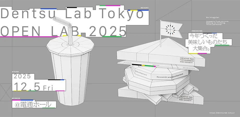 2023年12月5日(金)、東京都港区の電通ホールにて「Dentsu Lab Tokyo OPEN LAB 2025」が開催されます。このイベントでは、Dentsu Lab Tokyoが今年制作した新作プロトタイプ20点が一挙に公開されます。「Technology×Creativity」をテーマに、人々に新しい体験を提供するクリエイティブなR&DチームであるDentsu Lab Tokyoが、その集大成をお見せします。