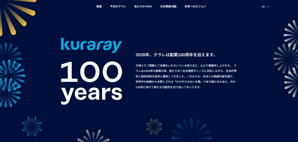 この特設サイトには、クラレグループの過去100年間の軌跡や、現在の事業内容、そして未来へのビジョンが分かりやすくまとめられています。特に「花火」というモチーフのキービジュアルは、伝統と革新、創造性を象徴しており、クラレの理念に強く結びついています。