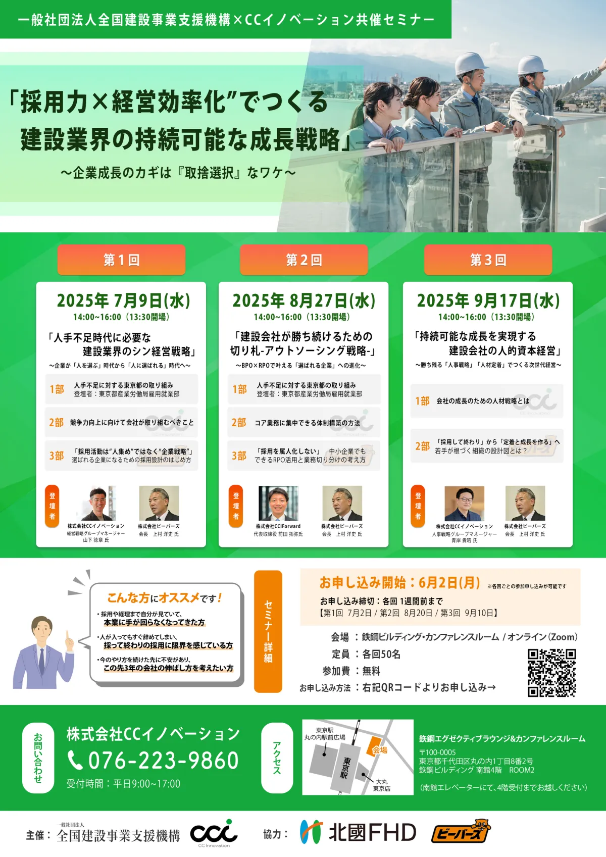 一般社団法人全国建設事業支援機構と株式会社CCイノベーションは、建設業界に特化した無料セミナーを開催します。このセミナーは、建設業界の経営者や人事担当者を対象にしており、現在直面している採用や経営に関する課題を解決するための実践的な知識を提供します。