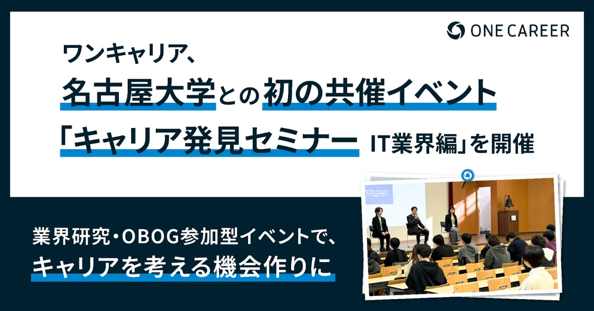 2025年11月19日、水曜日に名古屋大学にて、株式会社ワンキャリアが主催し、初めての共催イベント「名大生のためのキャリア発見セミナー -IT業界編-」が実施されました。本イベントは、名古屋大学のキャリアサポートセンターとの連携により、学生たちにIT業界の魅力や職業の選び方についての理解を深めることを目的としています。