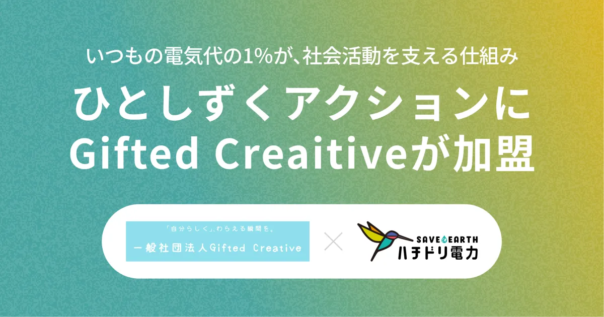 自然エネルギー100%で電力を供給する株式会社ボーダレス・ジャパンが運営する「ハチドリ電力」は、社会貢献活動を支援するユニークな取り組み「ひとしずくアクション」に新たに一般社団法人Gifted Creativeが加盟したと発表しました。このアクションの一環として、利用者からの電気代の1%が自動的に選んだ社会活動団体へ寄付されます。