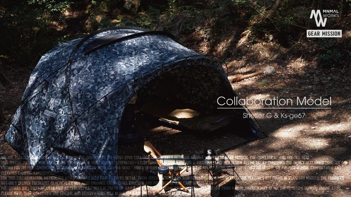 「SHELTER G」はアウトドアシーンでの高い評価を受けているシェルターです。一方、優れた暖房性能を誇る「KS-GE67」とのコラボレーションにより、より快適なキャンプスタイルを実現しました。この特別モデルは、普通の製品にはないこだわりが各所に施されており、機能性だけでなく見た目の美しさにも配慮されています。