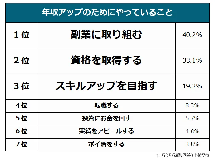 株式会社ビズヒッツが実施したアンケート調査によれば、社会人505人の年収アップのための取り組みが明らかになりました。本記事では、年収を上げるために人々がどのように行動しているのかを、ランキング形式で紹介します。