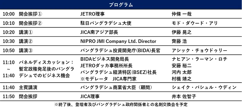 当日は、バングラデシュ商業省のシェイク・バシュル・ウディン大臣と、バングラデシュ投資開発庁(BIDA)のアシック・チョウドゥリー長官が参加し、バングラデシュの投資環境の改善に向けた取り組みを直接説明します。