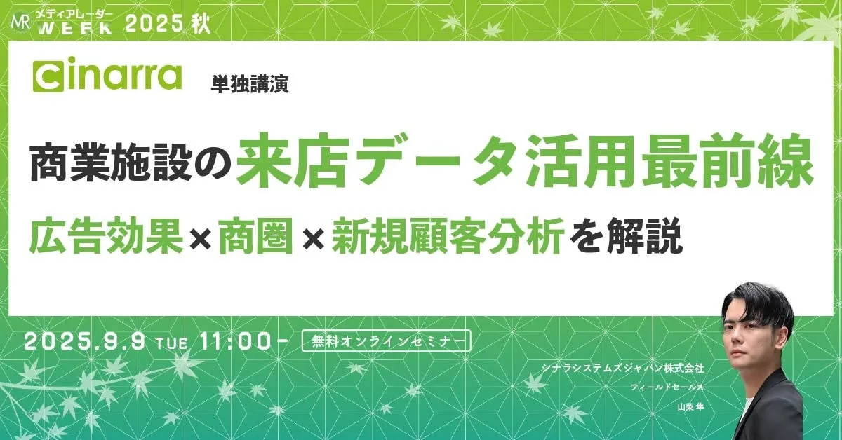 株式会社アイズが主催する「第19回メディアレーダーWEEK 2025 秋」が、2025年9月9日(火)にオンラインで開催されます。この回では、シナラシステムズジャパン株式会社が登壇し、商業施設や小売業、飲食業界における来店データの活用について解説します。今回は、あらゆる企業が直面する広告効果測定や商圏の見える化、新規顧客の発見・分析といった内容が盛り込まれており、必見のセミナーです。