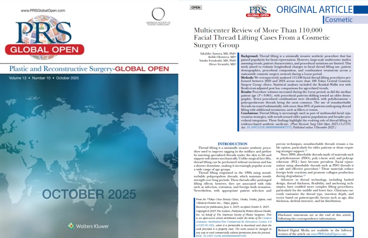 美容外科分野の新たな進展を感じさせるニュースが舞い込みました。TCB東京中央美容外科の田村貴彦医師が主導した「Multicenter Review of More Than 110,000 Facial Thread Lifting Cases From a Cosmetic Surgery Group」という論文が、国際的な美容外科学術誌「Plastic & Reconstructive Surgery-Global Open」において掲載されました。この研究は、全国に広がるTCBグループ内で行われた111,948件のスレッドリフト施術を対象に、5年間の施術動向や患者の特性を詳細に分析しています。