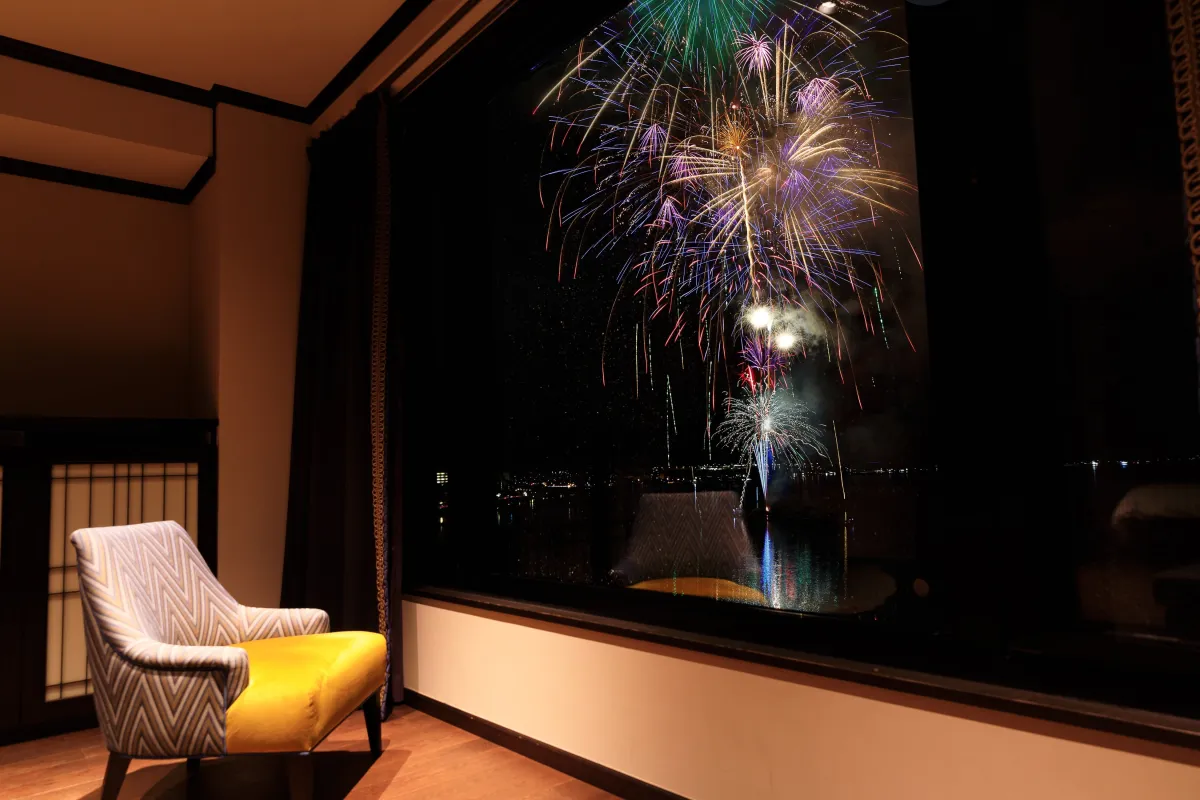 一方「上諏訪温泉 しんゆ」は、2024年に全館リニューアルを果たした宿。車椅子利用者やシニアのお客様にも安心なユニバーサルデザインの部屋があり、どなたでも花火を楽しめる配慮がなされています。お風呂からも花火を眺められるため、訪れる人々はゆったりと心癒される空間が広がっています。