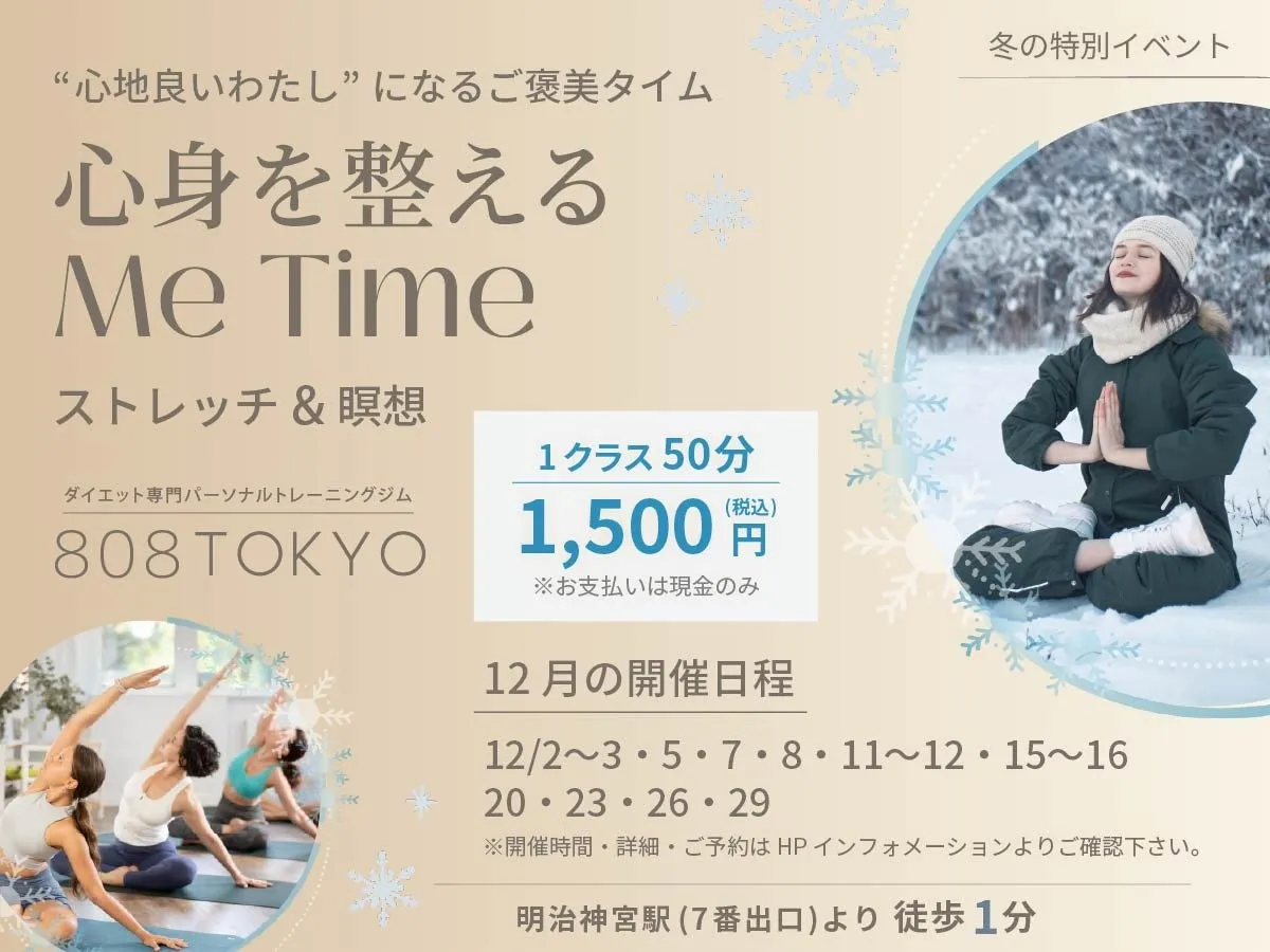 表参道のダイエット専門パーソナルトレーニングジム808TOKYOが主催する、ストレッチと瞑想をコンセプトにした特別イベント『~心身を整えるMe Time~』が開催されます。これは、日常生活のストレスを軽減し、心と身体の調和を取り戻すための特別な時間を提供するものです。