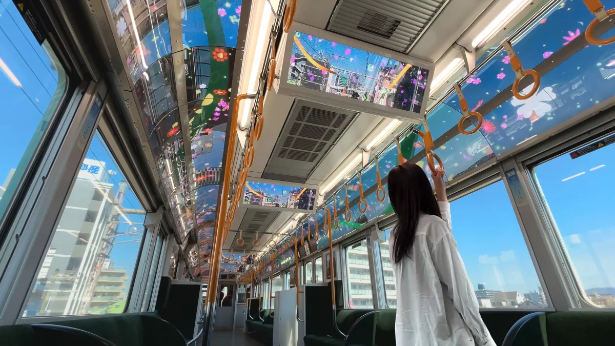 プロジェクトチームは、客室の全長にわたってLEDパネルを設置し、映像コンテンツを表示しています。これにより乗客は、オープンカーのような開放感を得ることができ、さらに外の景色もリアルタイムで映し出されます。AR(拡張現実)技術を使用し、「EXPO2025DesignSystem」に沿ったストーリーで万博への期待感を高め、さまざまなエフェクトやキャラクターが登場することで、車内がにぎやかに彩られる工夫がされています。