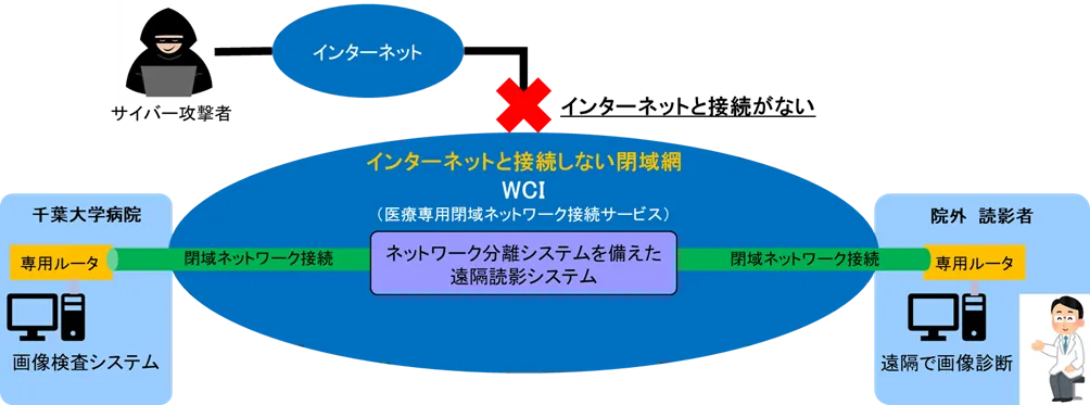 ビットブレインが開発した医療専用の閉域ネットワーク「WCI」は、インターネットとは物理的に接続されていないため、より高いセキュリティを確保しています。これにより、病院間での安全な通信が行えるようになり、遠隔読影システムも活用しやすくなります。このネットワークは、日本全国に広がる通信インフラを支え、データの高速かつ大容量の通信を実現します。