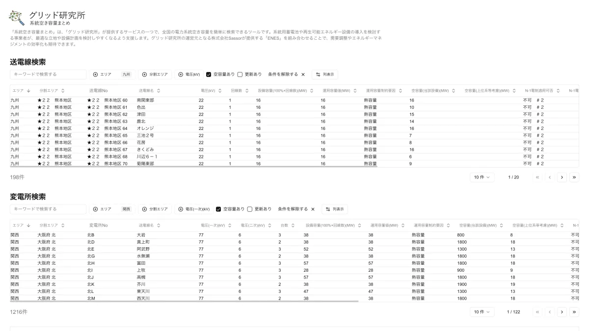 株式会社Sassorは、全国の電力系統空き容量情報を提供するサービス「系統空き容量まとめ」を新たに立ち上げ、これまでの東京エリアだけでなく、北海道、東北、中部、北陸、関西、中国、四国、九州の全国9エリアに対応しました。このサービスを通じて、企業や個人は電力系統の空き容量を一括で容易に検索し、再生可能エネルギーや系統用蓄電池の導入検討に役立てることができます。