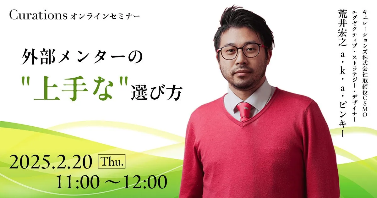 キュレーションズ株式会社は、2025年2月20日(木)に『外部メンターの"上手な"選び方』をテーマにした無料オンラインセミナーを開催します。このセミナーは、経営戦略や事業企画に関わる方、プロジェクトマネージャーなどに特に適しています。