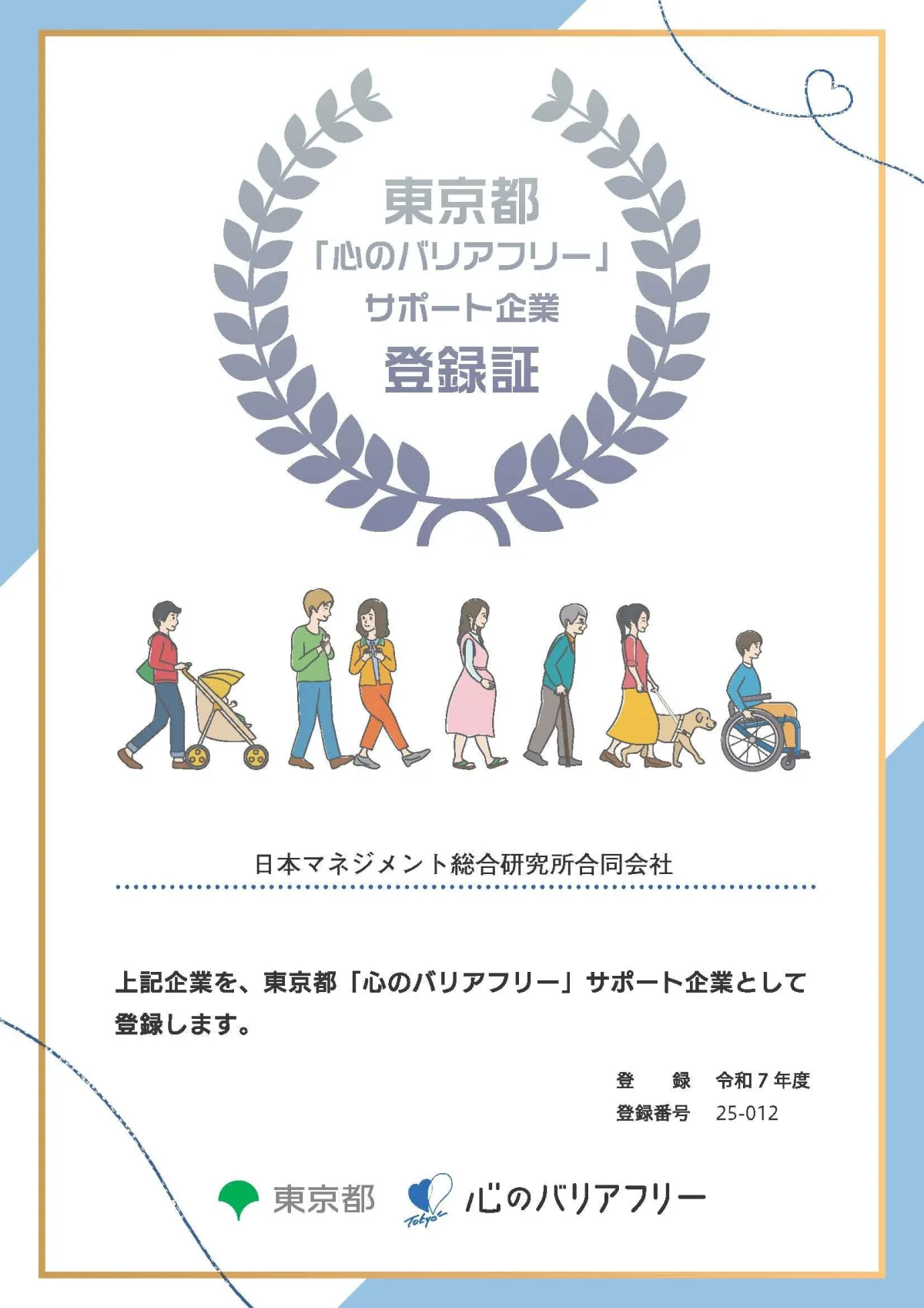 東京都の『心のバリアフリー』サポート企業に登録された日本マネジメント総合研究所