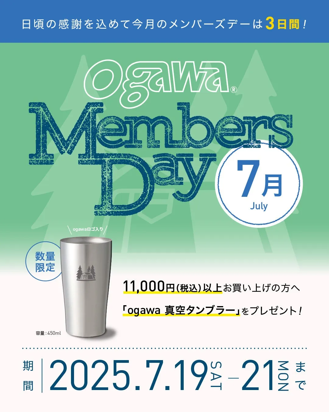 ogawaのキャンプ用品はその品質とデザインが高く評価されています。何度もリピートされるファンが多いのも納得です。7月のogawa MEMBERS DAYでは、仲間や家族と一緒にアウトドアを楽しむためのアイテムを見つけるチャンスです。ぜひ、この機会にogawaの世界を体験してみてください!